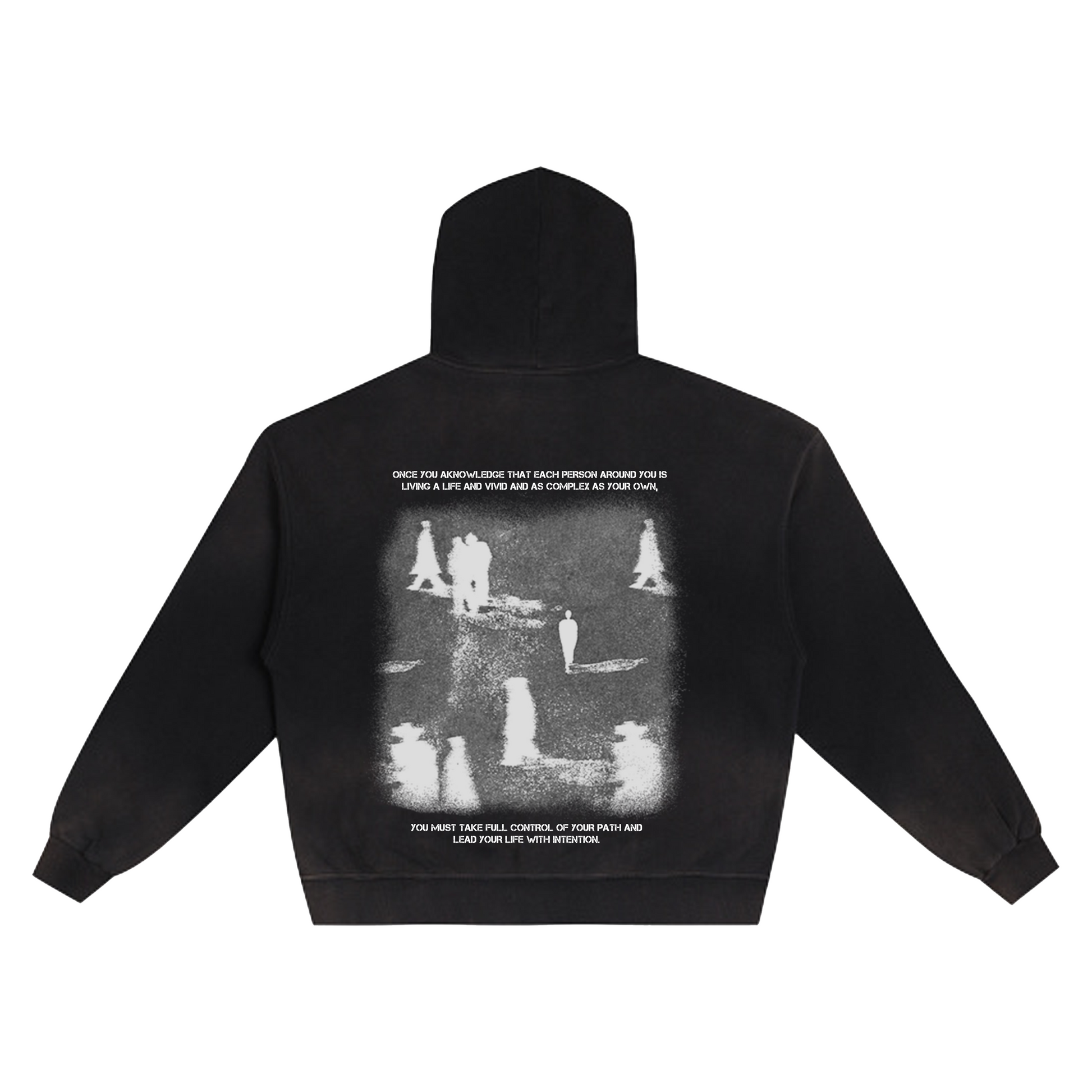 Minimal branding sits on the front, while the back features the Acknowledgement graphic. A grain textured composition of passing figures paired with reflective text, designed to capture themes of awareness, presence, and individuality. Elevated streetwear with depth, restraint, and quiet confidence.